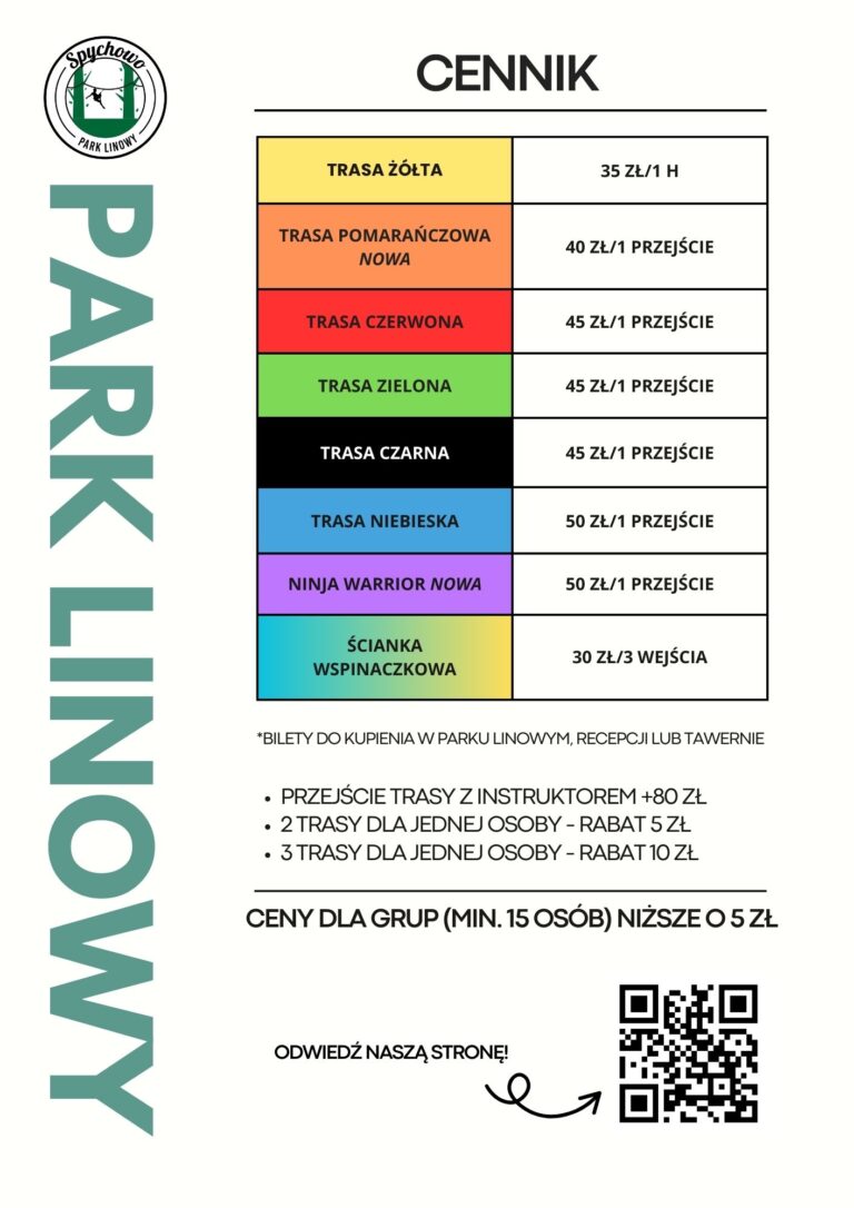 Trasy linowe są zróżnicowane zarówno pod względem wysokości jak i trudności ich pokonywania. Od trasy żółtej dla najmłodszych do niebieskiej dla najbardziej wymagających. W Parku Linowym Spychowo mogą bawić się zarówno klienci indywidualni jak i grupy zorganizowane np. spotkania firmowe, czy integracyjne.